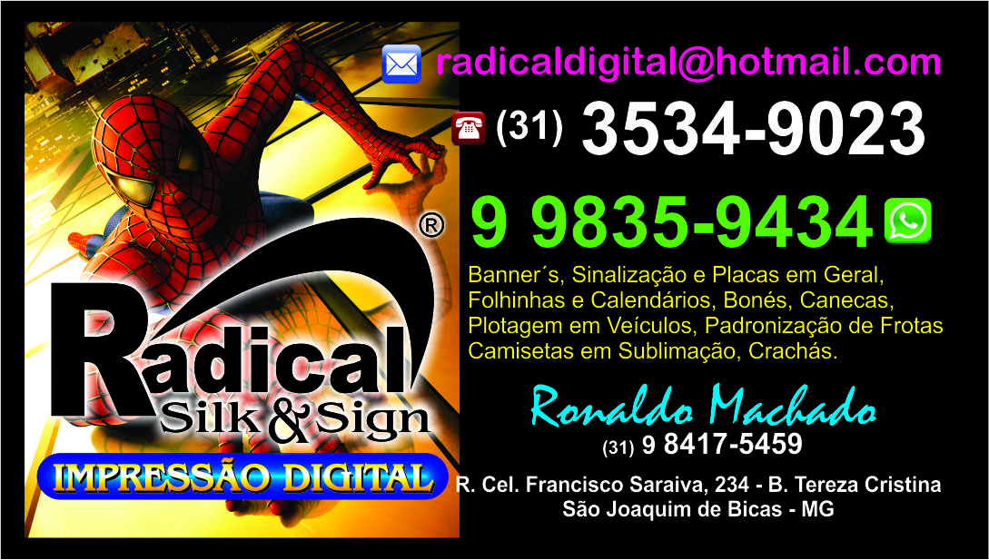 Fundada em 1991 por Ronaldo Machado Batista, no município de Igarapé-MG, a Radical Silk-Screen sempre demonstrou a intenção de atender a população, bem como os comerciantes de vários setores, com a prestação de serviços em Silk-screen (camisetas, cartazes, adesivos, folhinhas, etc). Em 1994 iniciamos atendimentos às empresas de pequeno porte de Igarapé e região.